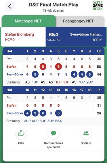 Spelet är jämt i början och efter 6 hål är det 1 up för Stefan. Hål 7, 8, 9 går till mej så 2 up vid halvtid.
