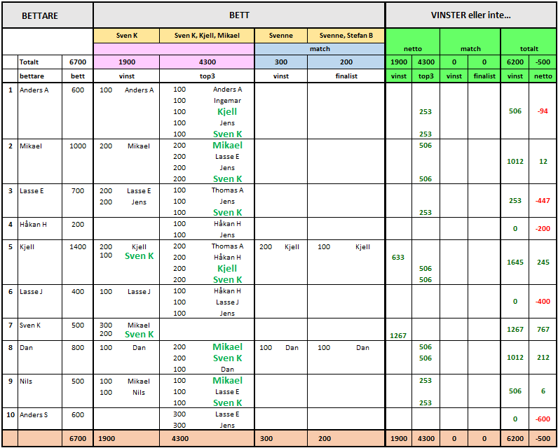 Totalt: 600 SEK N vinst: AA 100 N top3: AA, Sven, Kjell, Ingemar,Jens alla 100 |